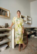 Een jurk die je beweging viert. De enkellange A-lijn, V-hals en wijde driekwartsmouwen geven lucht en vrijheid, terwijl de aquarelprint in zachte pasteltinten en nacréknopen voor subtiele glamour zorgen. Draag hem los voor nonchalante elegantie of accentueer je taille met de bindceintuur.