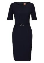 Jurk ‘Daleah’ van BOSS, met halve mouwen. Verzorgde zakelijke stijl voor een zelfverzekerde uitstraling. In dit hoogwaardige model is fijndradige, kreukvrije scheerwollen stof in een bijzonder ingetogen, figuurvolgende snit verwerkt. Een subtiel stoffen riempje met gesp accentueert op subtiele wijze de taille. 100% scheerwol. Ritssluiting met fijne naad aan de achterkant. Voering 54% viscose, 43% polyamide, 3% elastaan. Lengte ca. 98 cm. Voor deze jurk raden wij een stomerij aan. niet wasbaar. chloorbleken niet mogelijk. koud strijken. chemische reiniging, veilig. drogen in de droger niet mogelijk. 40, 42