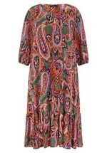 Jurk van EMILIA LAY met een elastische boord aan de 3/4-mouwen, zakken in de zijnaden en een aangezette strook bij de zoom. Modehit in fascinerende kleurenpracht zeer opvallend en heerlijk prettig in het dragen in wijde, ruimvallende snit Bovenste laag in lichte georgette van 100% viscose met paisleyprint, onderste laag in zachte jersey van 96% viscose, 4% elastan. Gecertificeerd volgens Standard 100 by OEKO-TEX®. Ieder model is uniek. Lengte in maat 42 ca. 120 cm. Machinewasbaar. fijnwas tot 30°. chloorbleken niet mogelijk. warm strijken. chemische reiniging. drogen in de droger niet mogelijk. 40, 42, 44, 46, 48, 50, 52, 54, 56