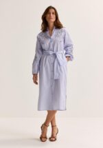 Preppy hemdjurk in fris ecokatoen met fijne blauw‑witte streepjes en speels folkloristisch borduurwerk op buste en wijde mouwen. Fronsjes aan de manchetten, een dubbele rugplooi en zijsplitten geven extra ruimte en beweging. Draag dit easy‑chic stuk met of zonder zijn bijhorende bindceintuur.