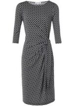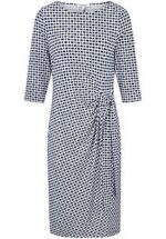 Jerseyjurk van PETER HAHN met 3/4-mouwen. Voor elke dag of een bijzondere gelegenheid dit model in modieus grafisch dessin staat altijd perfect Flatteuze jurk met knoopdetail en een bindceintuur voor. 95% viscose, 5% elastan. Lengte ca. 100 cm. Deze jurk is machinewasbaar. fijnwas tot 30°. chloorbleken niet mogelijk. warm strijken. chemische reiniging, veilig. drogen in de droger niet mogelijk. 48