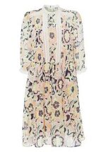 Jurk van UTA RAASCH met lange raglanmouwen, elastisch boordje onder aan de mouwen en ronde hals met een opstaand kraagje. Een droom in pastel zwierige jurk met print all-over van filigraan verwerkte bloemen en ranken. Elke jurk is uniek. Zorgvuldig verwerkt met lussen-knoopsluiting voor, riemlussen opzij en een smal bindceintuur in de taille. Rokdeel met een geplooide strook. Body met een onderjurk, de mouwen zijn iets transparant. 100% polyester. Voering 95% viscose, 5% elastan. Lengte ca. 100 cm. Deze jurk is machinewasbaar. fijnwas tot 30°. chloorbleken niet mogelijk. koud strijken. niet chemisch te reinigen. drogen in de droger niet mogelijk. 40, 42, 44, 46