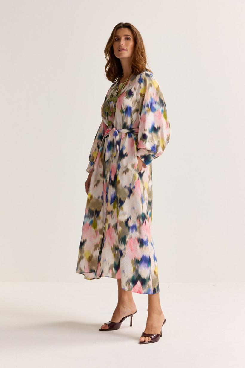 Een jurk die je beweging viert. De enkellange A-lijn, V-hals en wijde driekwartsmouwen geven lucht en vrijheid, terwijl de aquarelprint in zachte pasteltinten en nacréknopen voor subtiele glamour zorgen. Draag hem los voor nonchalante elegantie of accentueer je taille met de bindceintuur.