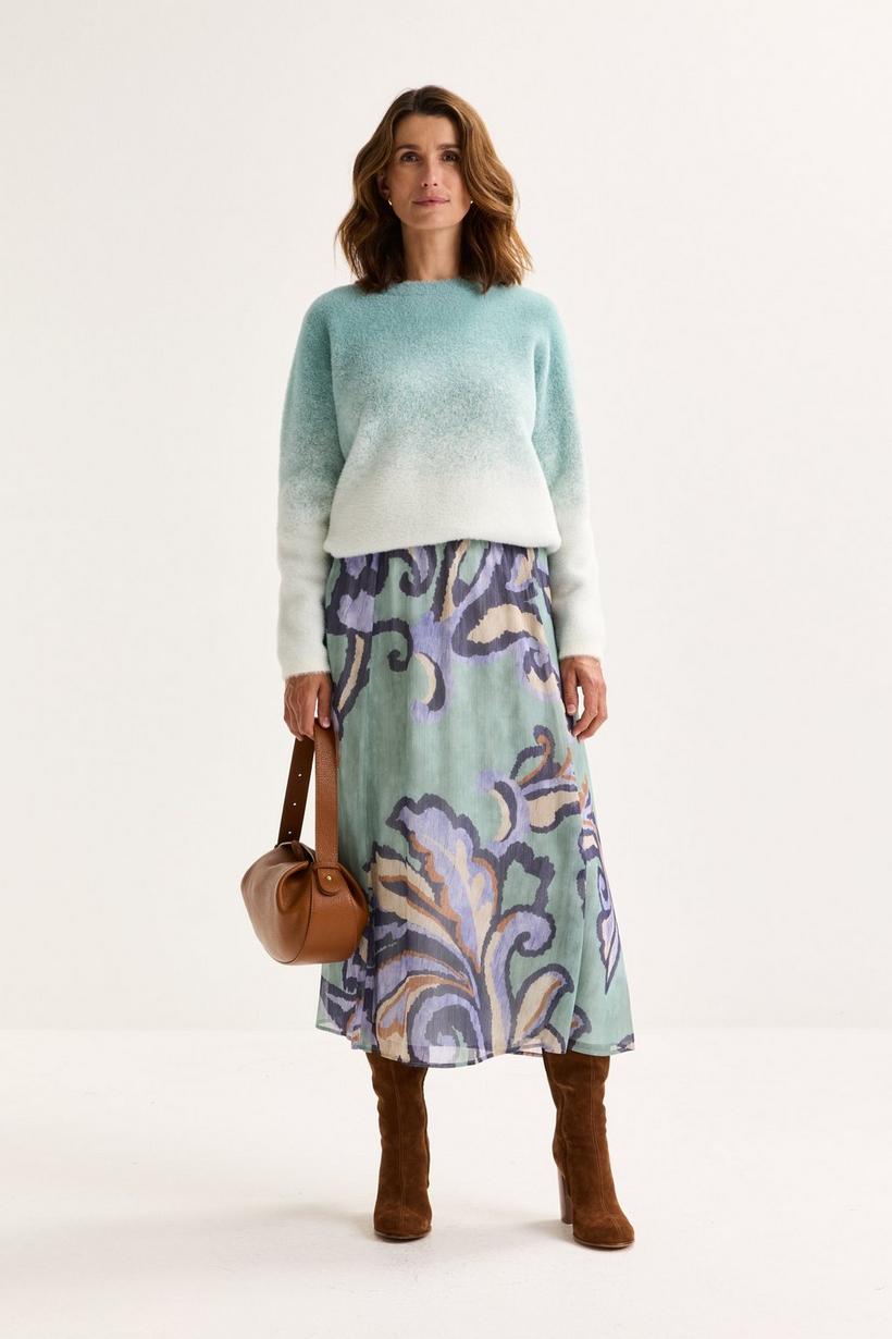 Deze vrouwelijke midirok in luchtige crinkle voile is een ode aan elegantie in beweging. De stof werd in banen geknipt om het silhouet te verlengen en te ferfijnen. De elastische tailleband zorgt voor comfort zonder in te boeten aan stijl, terwijl de barokke print in ijskleuren de rok een unieke uitstraling geeft. Dankzij de antistatische voering voelt de rok niet alleen heerlijk aan, maar blijft hij ook mooi vallen, zonder plakken of opkruipen. Dit elegante stuk is bovendien kreukvrij en je hoeft het niet te strijken.