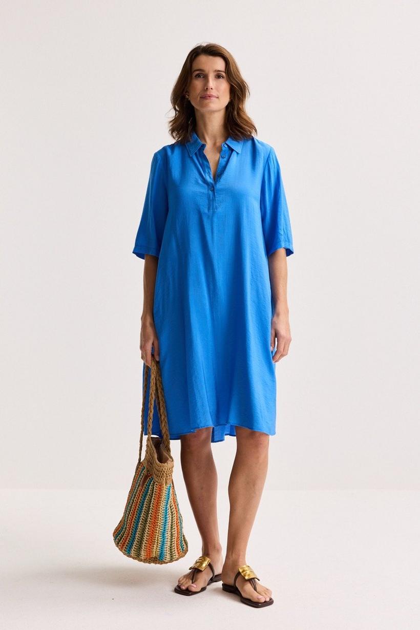 Zwierige A‑lijnjurk met polokraag en korte mouwen, gemaakt om vrij te bewegen — de diepe rugplooi doet wonderen. Een zomerse allrounder met effortless chic, afgewerkt met discrete gesigneerde knoopjes. En ja, ook praktisch: de diepe zijzakken verdwijnen elegant in de zijnaden.