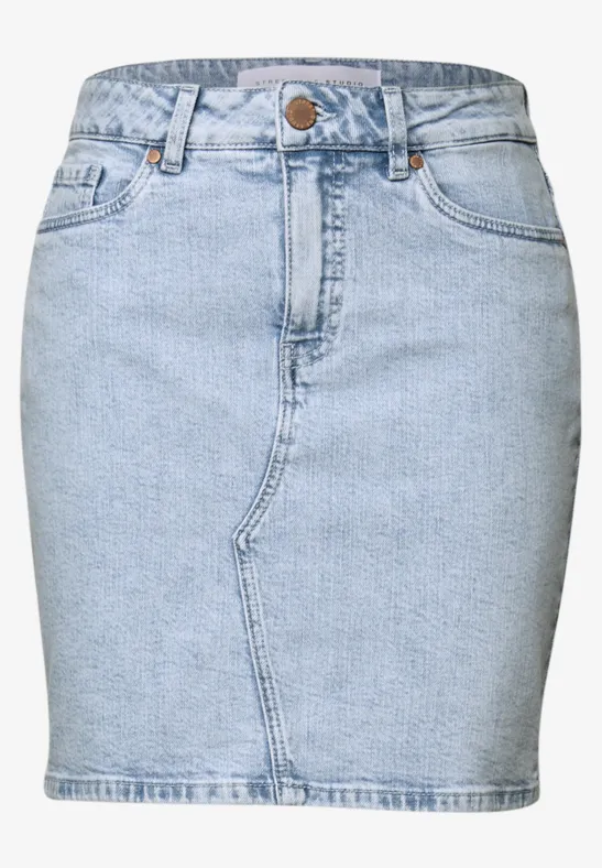 Deze knielange rok van Street One Studio voor dames heeft een trendy gebleekte look en een klassiek 5-pocketontwerp. De denimstof met katoenmix en stretch zorgt voor een comfortabele pasvorm en een behaaglijk gevoel. Combineer deze denim rok op verschillende manieren voor casual zomerstijlen.