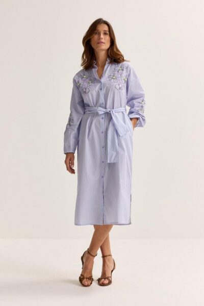 Preppy hemdjurk in fris ecokatoen met fijne blauw‑witte streepjes en speels folkloristisch borduurwerk op buste en wijde mouwen. Fronsjes aan de manchetten, een dubbele rugplooi en zijsplitten geven extra ruimte en beweging. Draag dit easy‑chic stuk met of zonder zijn bijhorende bindceintuur.