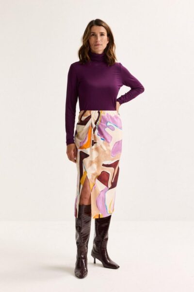 Deze drapérok is geen kledingstuk, het is een schilderij in beweging. Met zijn grote aquarelprint in zachte pastels en natuurtinten straalt hij pure elegantie uit. De soepele viscoseblend met subtiele vintage finish valt prachtig rond je silhouet, terwijl de drapage aan de taille en de hoge split vooraan een vleugje drama toevoegen. Gevoerd tot aan de knie en voorzien van een verborgen elastiek in de taille, combineert hij moeiteloos comfort met klasse. Perfect bij al je basics – maar allesbehalve basic.