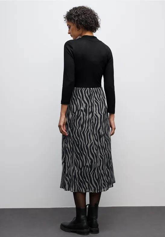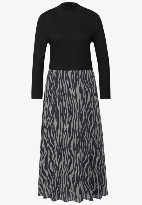 Deze midi-jurk voor dames van Street One Studio heeft een rok van mesh met luipaardprint en een effen geribde bovenkant. Met het trekkoord in de taille kun je het silhouet van de jurk aanpassen. Combineer hem met laarzen of sportschoenen voor een moderne alledaagse stijl.