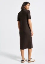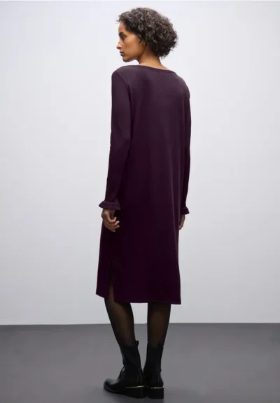 De geribde midi-jurk van Street One voor dames speelt handig met vrouwelijke details. Splitjes aan de zijkanten, ruches op de mouwen en een klassieke ronde halslijn maken er een stijlvol stuk van. De comfortabele stof voelt zacht aan en benadrukt je silhouet op een moderne manier.