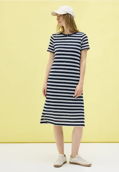 De gestreepte ajourjurk van CECIL voor dames maakt indruk met zijn gehaakte look en vrouwelijke ronde halslijn. De kapmouwtjes en zijsplitten zorgen voor een zomerse luchtigheid en aangenaam draagcomfort. Ideaal voor een luchtige look op warme dagen.