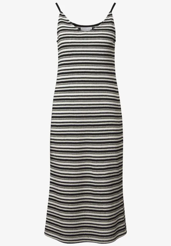 Deze gestreepte midi-jurk van Street One voor dames combineert een casual gebreide look met een maritieme flair. De boothals en korte mouwen geven de look een moderne afwerking. De comfortabele katoenmix maakt deze jurk tot een feelgood stuk voor elke dag en voor in de vrije tijd.
