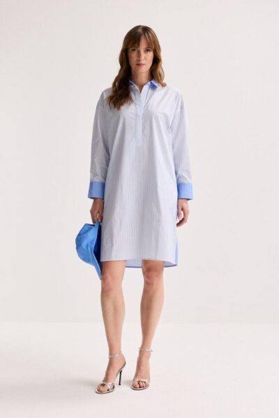 Preppy krijgt hier een nieuwe betekenis: een biokatoenen jurk die speels met overhemdstreepjes speelt. De verborgen knopen, frisse rugplooi en subtiele zijsplitjes geven hem die nonchalante chic die je meteen omarmt. Licht, luchtig en heerlijk comfortabel—alsof je in één beweging klaar bent voor stijl én spontaniteit.