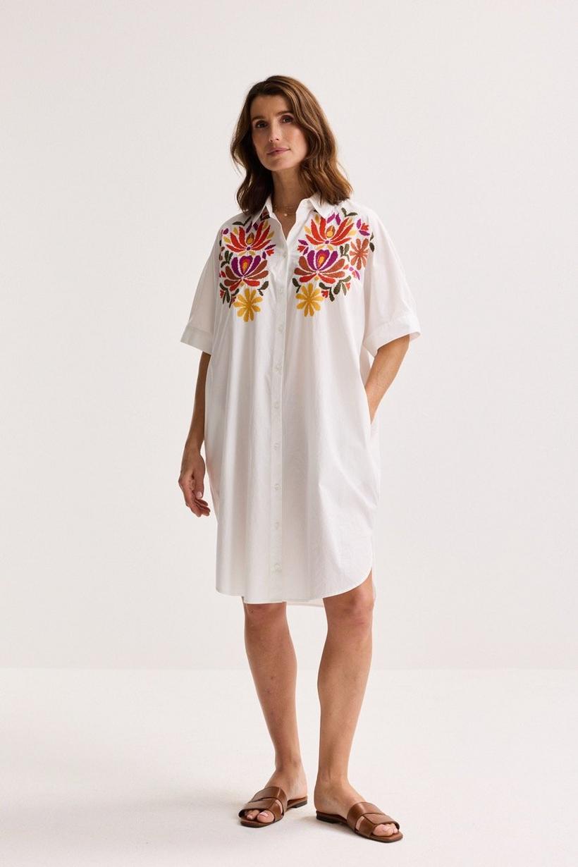 Jouw zomerheld: een nonchalant chique hemdjurk in katoen met korte vleermuismouwen, afgeronde zoom en een luchtige, ruimvallende pasvorm. Voorop schittert felgekleurde kruissteek‑borduurwerk dat een subtiel boho‑chic accent geeft. Licht, speels en onweerstaanbaar.