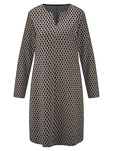 Jersey jurk van PETER HAHN met lange mouwen en kleine V-opening bij de ronde hals. Bijzonder comfortabel model van hoogwaardige heavy-jersey met grafisch minimal-dessin. Een perfecte jurk voor elke dag en elk figuur in iets uitlopende snit. 65% viscose, 32% polyamide, 3% elastan. Lengte ca. 98 cm. Machinewasbaar. fijnwas tot 30°. chloorbleken niet mogelijk. koud strijken. chemische reiniging. drogen in de droger niet mogelijk. 36, 38, 40, 42, 44, 46, 48, 50