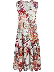 Jurk van PETER HAHN. Met verbrede schouders en omslag aan de korte mouwen. Vrolijke eyecatcher van lichte stof De veelkleurige borduurselprint ziet er op elke jurk net iets anders uit. Soepelvallend hemdblousemodel met blinde doorknoopsluiting, afgeronde zoom en zijsplitten. Van 100% viscose uit duurzame bosbouw. Gecertificeerd volgens Standard 100 by OEKO-TEX®. Lengte ca. 120 cm. Deze jurk is machinewasbaar. fijnwas tot 30°. chloorbleken niet mogelijk. warm strijken. chemische reiniging. drogen in de droger niet mogelijk. 36, 38, 40, 42, 44, 46, 48, 50, 52