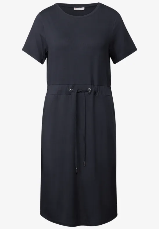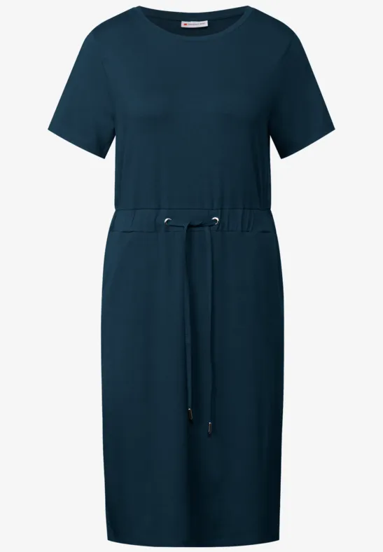 Deze knielange jersey jurk van Street One voor dames is een casual allrounder voor elke dag. De viscosemix met stretch zorgt voor een zacht gevoel, terwijl de ronde halslijn, korte mouwen en taille met tunnelkoord naar wens kunnen worden aangepast. Zijzakken ronden de sportieve, vrouwelijke look af.
