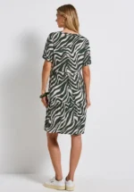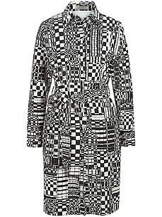 Jersey jurk van PAGANNE met een klein splitje op de 1/1 mouw. De grafische zwart-wit print maakt elk model uniek. Overhemdachtige snit met doorlopende knoopsluiting en zakken in de zijnaden – een ongecompliceerde jurk voor elke dag of een evenement. Kan met of zonder ceintuur worden gedragen. 88% polyester, 12% elastaan. Lengte ca. 100 cm. Deze jersey jurk is machinewasbaar. wasbaar tot 30°. chloorbleken niet mogelijk. koud strijken. chemische reiniging. drogen in de droger niet mogelijk. 36, 38, 40, 42, 44, 46, 48