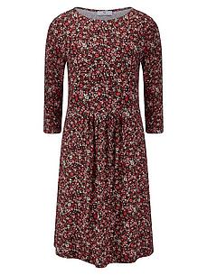 Jersey jurk van PETER HAHN zonder sluiting. Met 3/4-mouwen. Heerlijk comfortabel, flatteus en modern met diepgetinte bloemetjesprint Losjes vallende stijl met plooitjes bij de deelnaad voor en een iets uitlopende zoom. LENZING™ ECOVERO™-viscose is een geregenereerde cellulosevezel. Elke jurk is uniek. Lengte ca. 96 cm. Het meest pure draagplezier van zachte, huidvriendelijke jersey van 95% viscose, 5% elastan. Machinewasbaar. fijnwas tot 30°. chloorbleken niet mogelijk. koud strijken. chemische reiniging. drogen in de droger niet mogelijk. 42, 44, 46, 48, 50, 52