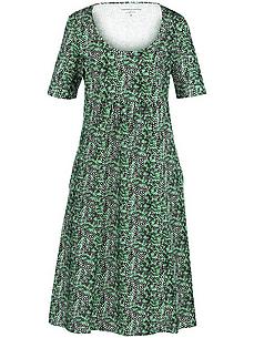 Jerseyjurk Selma van Green Cotton met korte mouwen. Zomers, stijlvol, met een dessin van kleine rondjes in frisse kleuren. Betoverend vrouwelijk is het comfortabele model met een diepe ronde hals, plooitjes onder de buste en licht uitlopend rokdeel. Met 2 praktische naadzakken. 100% katoen. Lengte ca. 110cm. Deze jurk is machinewasbaar en kan in de droger. wasbaar tot 40°. chloorbleken niet mogelijk. warm strijken. niet chemisch te reinigen. drogen in de droger niet mogelijk. 36, 38, 40, 42, 44, 46, 48, 50, 52