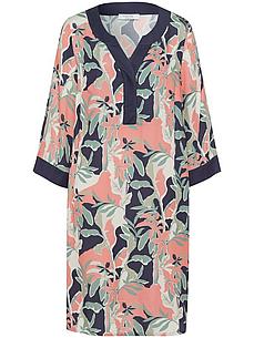 Jurk van PETER HAHN met 3/4-mouwen en brede unikleurige stroken langs de hals en aan de mouwen. Heerlijk comfortabel en flatteus voor het figuur. In de stijl van een losjes vallend overgooiertje van soepel weefsel van 100% viscose. De opvallend aantrekkelijke bloemenprint maakt iedere jurk uniek. Voering 100% viscose. Lengte ca. 100 cm. Deze jurk is machinewasbaar. fijnwas tot 30°. chloorbleken niet mogelijk. warm strijken. niet chemisch te reinigen. drogen in de droger niet mogelijk. 36, 38, 40, 46