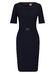 Jurk ‘Daleah’ van BOSS, met halve mouwen. Verzorgde zakelijke stijl voor een zelfverzekerde uitstraling. In dit hoogwaardige model is fijndradige, kreukvrije scheerwollen stof in een bijzonder ingetogen, figuurvolgende snit verwerkt. Een subtiel stoffen riempje met gesp accentueert op subtiele wijze de taille. 100% scheerwol. Ritssluiting met fijne naad aan de achterkant. Voering 54% viscose, 43% polyamide, 3% elastaan. Lengte ca. 98 cm. Voor deze jurk raden wij een stomerij aan. niet wasbaar. chloorbleken niet mogelijk. koud strijken. chemische reiniging, veilig. drogen in de droger niet mogelijk. 40