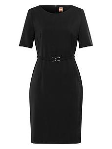 Jurk ‘Daleah’ van BOSS, met halve mouwen. Verzorgde zakelijke stijl voor een zelfverzekerde uitstraling. In dit hoogwaardige model is fijndradige, kreukvrije scheerwollen stof in een bijzonder ingetogen, figuurvolgende snit verwerkt. Een subtiel stoffen riempje met gesp accentueert op subtiele wijze de taille. 100% scheerwol. Ritssluiting met fijne naad aan de achterkant. Voering 54% viscose, 43% polyamide, 3% elastaan. Lengte ca. 98 cm. Voor deze jurk raden wij een stomerij aan. niet wasbaar. chloorbleken niet mogelijk. koud strijken. chemische reiniging, veilig. drogen in de droger niet mogelijk. 40, 42