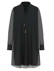 JOOP jurk met lange mouwen en een V-hals, afgewerkt met gouden korenbloemranden op de strikbanden. Deze uitzonderlijk comfortabele, losvallende jurk heeft een uitlopend silhouet en een plooi aan de achterkant. Gemaakt van een transparante stof. 100% gerecycled polyester. Een voering van 91% polyester en 9% elastaan zorgt voor ondoorzichtigheid. Lengte ca. 93 cm. Deze jurk is machinewasbaar. speciale fijnwas tot 30°. chloorbleken niet mogelijk. koud strijken. chemische reiniging, veilig. drogen in de droger niet mogelijk. 34, 36, 38, 40