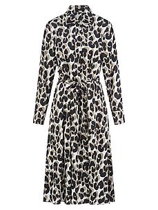 Jurk van EMILIA LAY met lange mouwen. Luipaard allover, een trend die zeer opvallend is Op het soepele weefsel ziet de print er bijzonder chic uit en maakt bovendien elke jurk uniek. Figuurvriendelijke stijl in uitlopende A-lijn met ruime plooi onder de knoopsluiting, omslagkraag en korte, verborgen knoopsluiting. U kunt de jurk losjes vallend dragen of er met de bindceintuur een aansluitend model van maken. Van 65% viscose, 35% polyester. Lengte in maat 42 ca. 115 cm. Machinewasbaar. fijnwas tot 30°. chloorbleken niet mogelijk. warm strijken. chemische reiniging. drogen in de droger niet mogelijk. 40, 42, 44, 46, 48, 50, 52, 54, 56