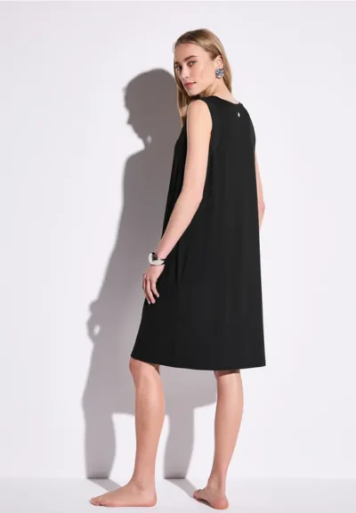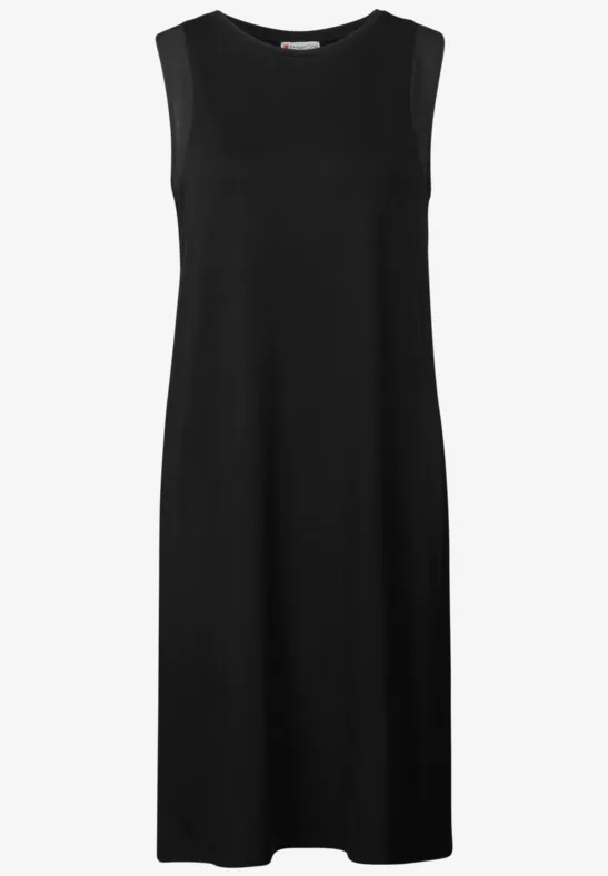 Deze knielange jurk van Street One voor dames heeft een eenvoudige snit en delicate chiffondetails op de bandjes. De ronde hals benadrukt de klassieke look, terwijl de viscosemix met stretch zorgt voor een comfortabel gevoel.
