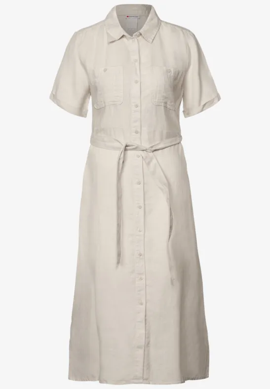 Deze midi-jurk van Street One voor dames heeft een lichtgewicht linnen stof en een vrouwelijk silhouet. De overhemdkraag, borstzakken en steekzakken en de doorlopende knoopsluiting geven de jurk met korte mouwen een klassieke look. Je kunt de taille benadrukken met de strikceintuur, terwijl zijsplitten modieuze details toevoegen.