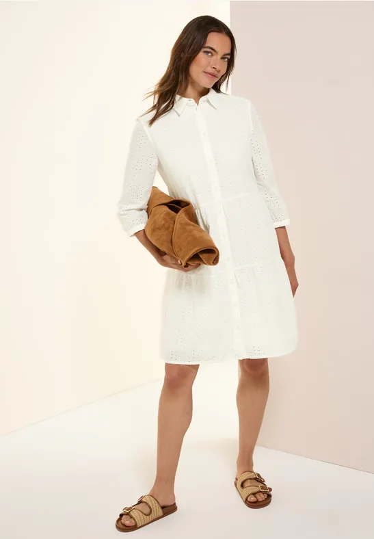 Deze knielange jurk van CECIL voor dames zal je betoveren met het modieuze eyeletborduursel en de zomerse volants. De overhemdkraag en 3/4-mouwen voegen klassieke accenten toe. Dankzij het zuivere katoen is hij comfortabel om te dragen.