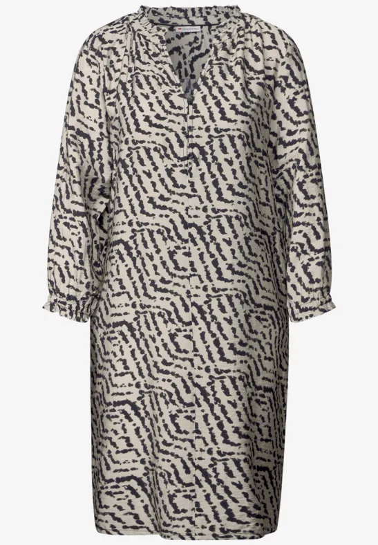 Deze knielange jurk van Street One voor dames heeft een modieus patroon en geraffineerde details. De halsopening met split en knoopdetail, de lange mouwen met elastische manchetten en de praktische steekzakken maken dit de perfecte metgezel voor elke dag. De zachte viscosemix maakt het comfortabel om te dragen.