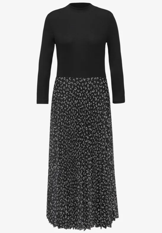 Deze midi-jurk van Street One voor dames heeft een spannende mix van texturen en een modern silhouet. De effen geribde bovenkant ontmoet een vloeiende rok met geplooide patronen van mesh. Een col en 3/4 mouwen maken de stijlvolle look af – perfect voor speciale gelegenheden.