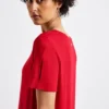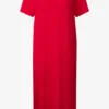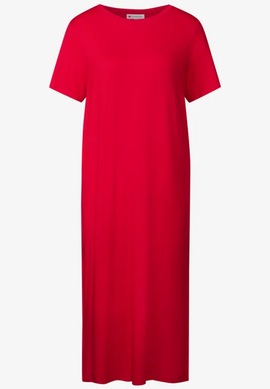 Deze knielange jersey jurk in een effen kleur van Street One voor dames heeft een ronde hals met een uitsnede en korte mouwen. De viscosemix met stretch biedt een comfortabele pasvorm en maakt het een veelzijdige metgezel voor elke dag.