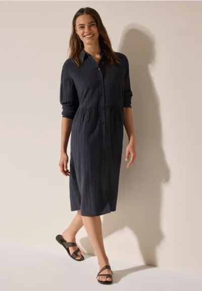 De blousejurk met strepenstructuur van CECIL is een trendy en comfortabel kledingstuk voor dames. Met zijn lange turn-up-mouwen, een klassieke kraag en een knooppas zorgt hij voor een casual look. Met zijn comfortabele viscosemix en een lengte die tot onder de knie valt, is hij perfect voor elke dag.