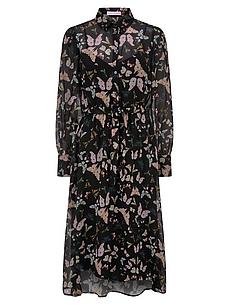 Jurk van MARCEL OSTERTAG met brede manchet aan de lange mouwen. Elegant en een beetje speels van fijn, iets transparant weefsel met een fascinerende butterfly-print op een donker fond, waardoor iedere jurk een uniek exemplaar wordt. Casual, maar iets getailleerde stijl met een overhemdkraag, korte knoopsluiting, bindstrik, naadzakken en plooistelling achter. De jurk heeft een onderjurk van 100% viscose. 100% viscose. Lengte ca. 120 cm. Machinewasbaar. fijnwas tot 30°. chloorbleken niet mogelijk. warm strijken. chemische reiniging. drogen in de droger niet mogelijk. 36, 38, 40, 42, 44, 46, 48