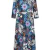Jurk van MYBC met ronde hals en een koraalrode contraststrook bij de boord van de wijde 3/4-mouwen. Summer in the city Opvallend modieus, luchtig en bijzonder comfortabel, in losjes vallende stijl met steekzakken opzij De palmenprint zorgt voor een vakantiegevoel en maakt elke jurk uniek. 100% viscose. Lengte ca. 100 cm. Machinewasbaar. fijnwas tot 30°. chloorbleken niet mogelijk. warm strijken. chemische reiniging, veilig. drogen in de droger niet mogelijk. 36, 38, 40, 42, 44, 46, 48