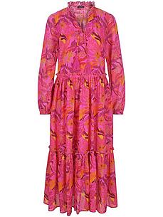 Jurk van MYBC met een elastische boord aan de lange mouwen. Luchtig, zomers en bijzonder trendy it-piece met fascinerende print in powerkleuren In deze elegante strokenjurk met ruchekraag, bindstrikje bij de hals en wijde, losjes vallende rok met ruches aan de breedtedeelnaden wordt u dé ster van elk event. Elke jurk is uniek. Van 100% katoen. Voering 100% viscose. Lengte ca. 128 cm. Machinewasbaar. fijnwas tot 30°. chloorbleken niet mogelijk. warm strijken. chemische reiniging. drogen in de droger niet mogelijk. 38, 40, 42