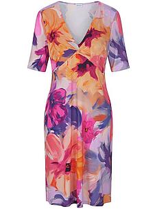 Jurk van RÖSCH in een charmante wikkel-look met 1/2 mouwen en geknoopte rimpels bij de diepe V-hals. De weelderige bloemenprint ontvouwt een inspirerende gloed van kleur op de zachte, vloeiende single jersey. 96% viscose, 4% elastaan. Lengte ca. 95 cm. Deze jurk is machinewasbaar. fijnwas tot 40°. chloorbleken niet mogelijk. niet strijken. niet chemisch te reinigen. drogen in de droger niet mogelijk. 36, 38, 40, 44, 50