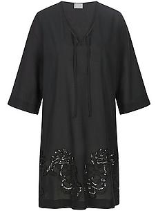 Jurkje van HUTSCHREUTHER licht transparante stof van 100% katoen met strikbandje bij de V-hals en wijde 3/4 mouwen met split. Opvallend mooi het gekrulde borduursel op de zoom. Lengte ca. 90 cm. Wij raden aan om deze jurk met de hand te wassen. handwas. chloorbleken niet mogelijk. warm strijken. niet chemisch te reinigen. drogen in de droger niet mogelijk. 36, 38