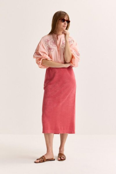 Stijlvolle 5-pocket kokerrok in gebleekte ringspun denim met stretch, die altijd perfect aansluit en je silhouet prachtig verlengt. De kniehoge split aan de achterkant biedt optimale bewegingsvrijheid.