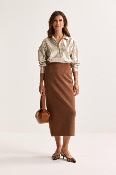 Subtiele glitters, een grote split opzij en een elegante snit: deze kuitlange kokerrok in stretchy jersey is een feest voor het silhouet. De onzichtbare tailleband zit als gegoten, de satijnen afwerking binnenin houdt de vorm perfect. Gekleed genoeg voor een party, relaxed genoeg voor een trui.