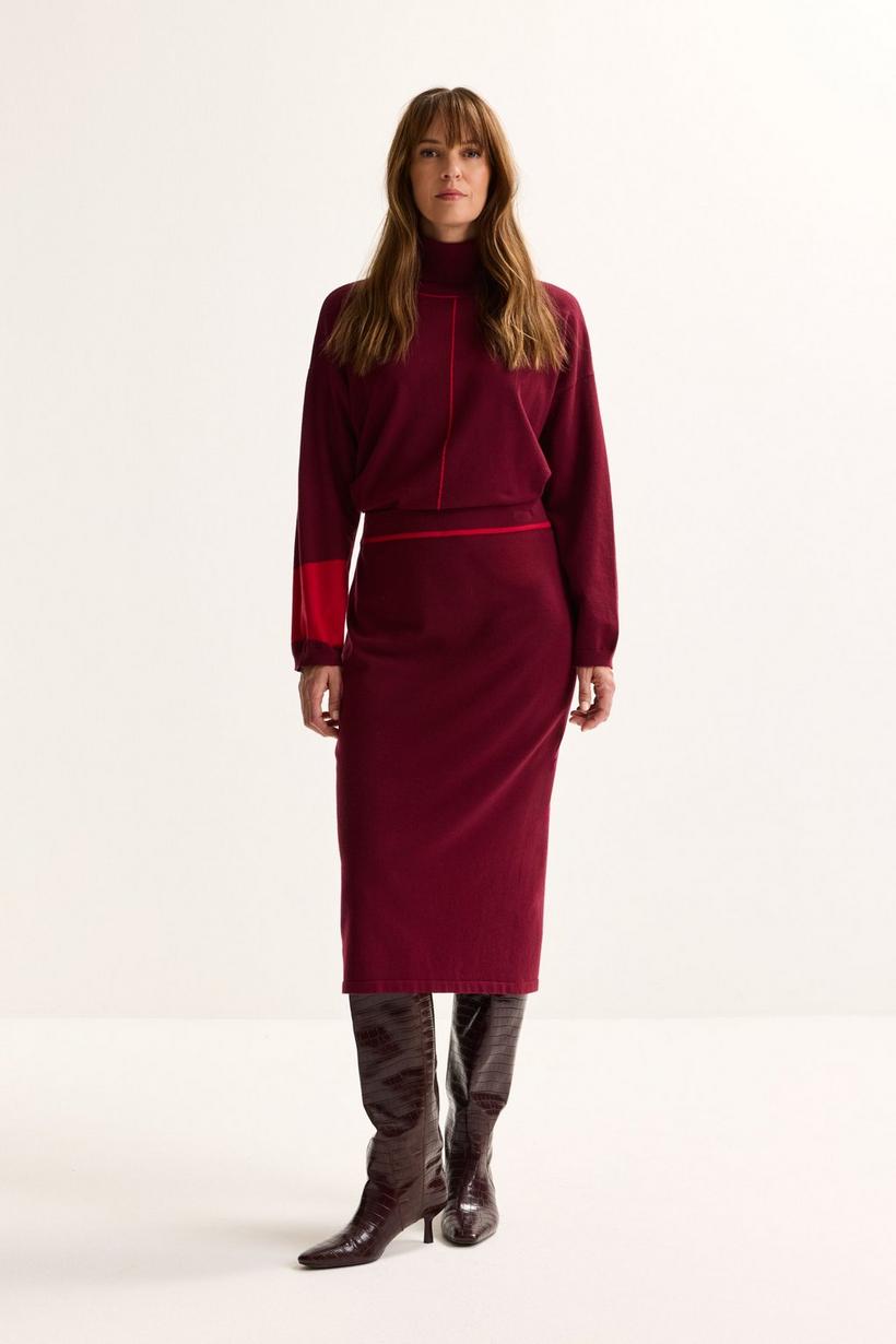 Deze kuitlange kokerrok in ultrazacht tricot omhelst je silhouet met finesse. De elastische tailleband zorgt voor een flatterende pasvorm die je rondingen accentueert en je figuur optisch verlengt. De contrasterende bies aan de taille geeft een subtiele, grafische touch. En goed nieuws voor de gevoelige huid: deze rok bevat geen wol, enkel comfort.