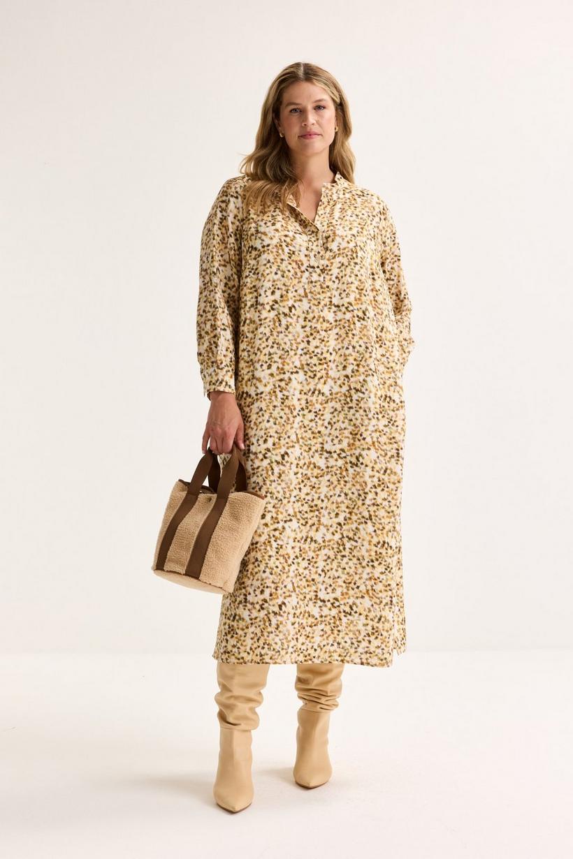 Deze stijlvolle, losvallende jurk op kuitlengte is een echte allrounder voor het nieuwe seizoen. De abstracte print in warme herfstkleuren op een zachte viscosemix met vintage look geven hem een eigentijdse charme. De rechte snit, dubbele rugplooi en zijsplitten zorgen voor een elegante beweging en ultiem draagcomfort. En de zakken, subtiel verborgen in de zijnaden, zijn een praktische bonus die je elke keer opnieuw weet te waarderen. Je jurk is volledig gevoerd met antistatische voering. Draag hem met of zonder zijn bindceintuur.