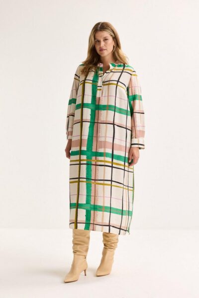 Deze stijlvolle, losvallende jurk op kuitlengte is een echte allrounder voor het nieuwe seizoen. De ruitenprint in frisse seizoenskleuren op een zachte viscosemix met vintage lookgeven hem een eigentijdse charme. De rechte snit, dubbele rugplooi en zijsplitten zorgen voor een elegante beweging en ultiem draagcomfort. En de zakken, subtiel verborgen in de zijnaden, zijn een praktische bonus die je elke keer opnieuw weet te waarderen.