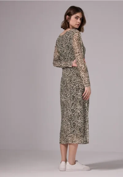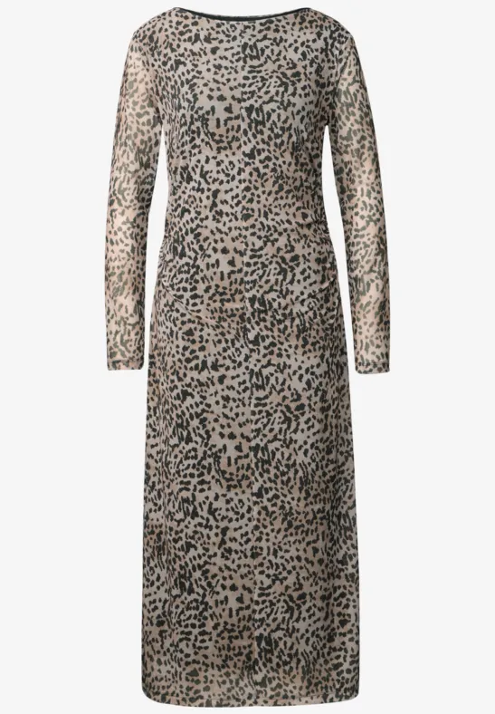 Deze netstof jurk van Street One Studio voor dames heeft een modieuze luipaardprint en flatterende plooien in de taille. De boothals en lange mouwen creëren een modern silhouet. De materiaalmix met stretch biedt een hoog draagcomfort.