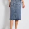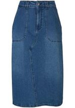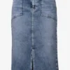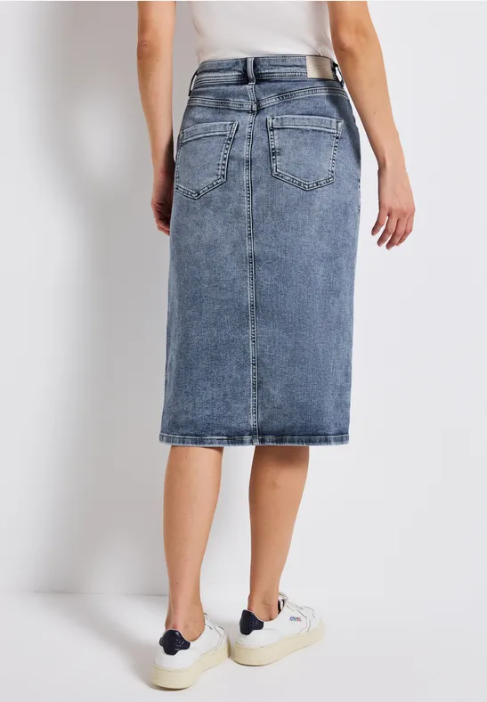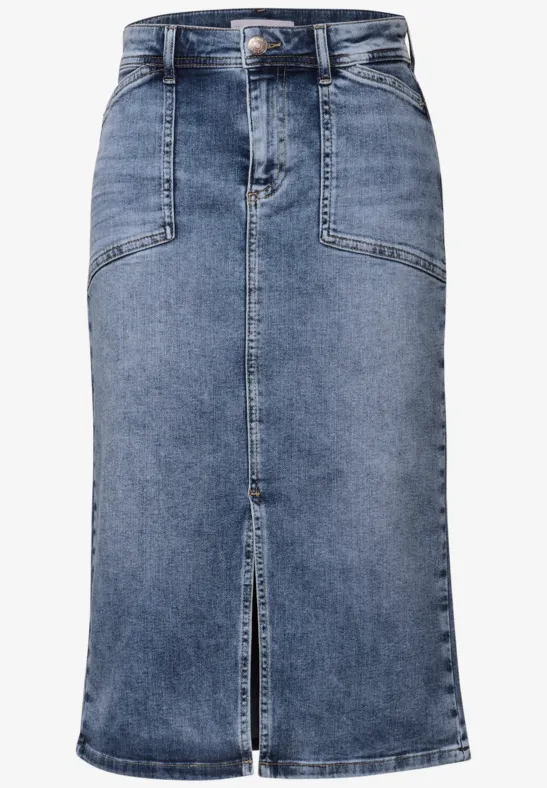 De denim rok van Street One voor dames heeft een trendy midi model met een split aan de voorkant. Het High Waist model en de katoenmix met stretch zorgen voor een vrouwelijke pasvorm en draagcomfort. Opgestikte zakken maken de look functioneel en stijlvol af.
