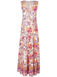Mouwloze jersey jurk ‘Lone’ van GREEN COTTON. Met V-hals. Een flatteuze eyecatcher in trendy hippielook met mooie dromerige print van grote bloemen en een expressieve brede rand in sensationele kleuren. Casual en toch verleidelijk vrouwelijk met kleine ruches op de schouders, speelse plooitjes onder de buste en een lang, uitlopend rokdeel met aangerimpelde stroken. 100% katoen, GOTS-gecertificeerd. Lengte ca. 135 cm. Deze mouwloze jersey is machinewasbaar. wasbaar tot 40°. chloorbleken niet mogelijk. warm strijken. niet chemisch te reinigen. drogen in de droger niet mogelijk. 36, 38, 40, 42, 44, 46, 48, 50, 52