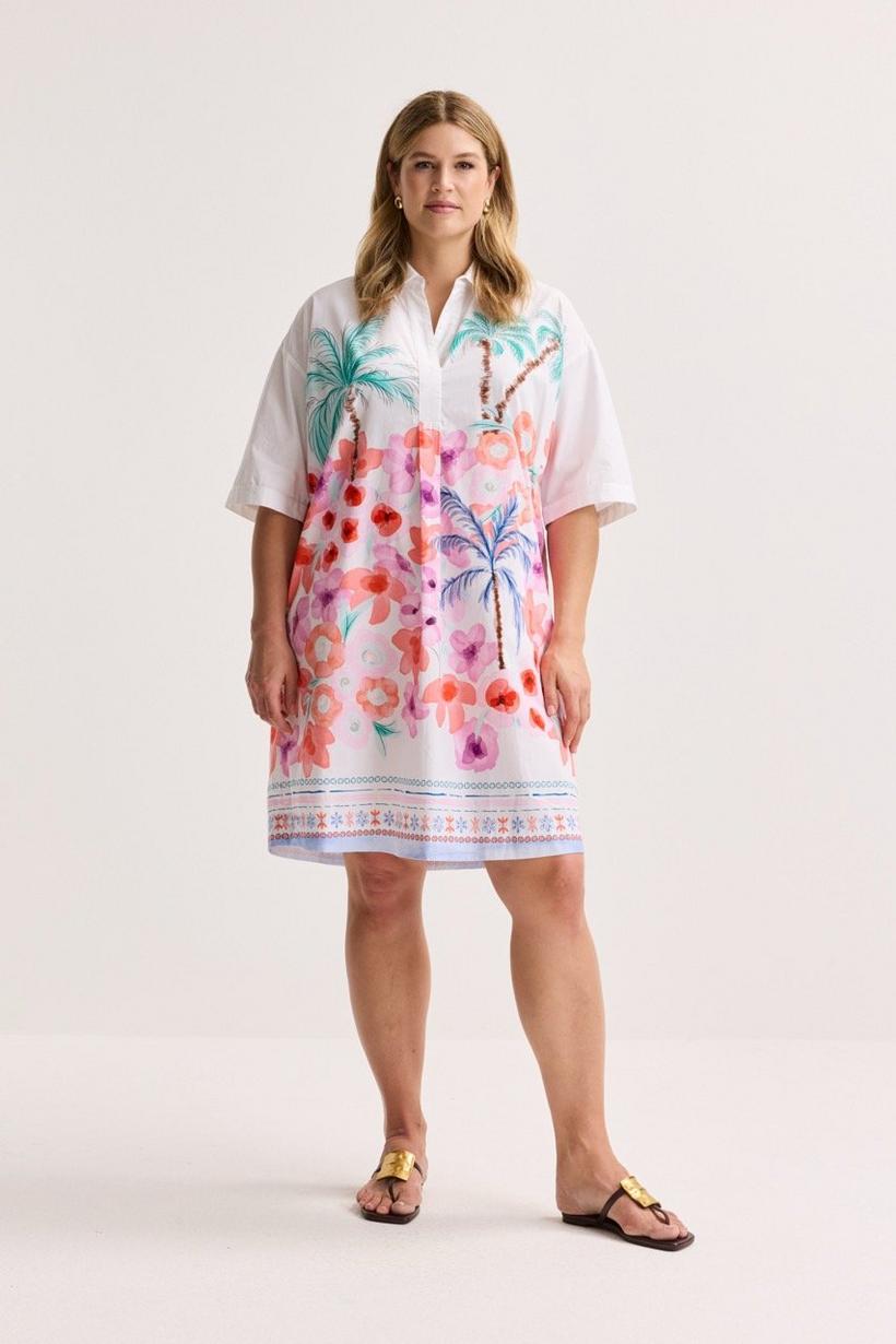 Tijdloze chic met een vleugje waw-factor. Deze polojurk in crispy popeline, versierd met een schilderachtige Rivièra‑tekening, is een echte blikvanger. De dubbele rugplooi en de platte plooi vooraan geven hem een elegante, flatterende swing, terwijl de verborgen steekzakken in de schuine siernaden subtiel comfort bieden. Perfect voor stralende vakantiefoto’s.